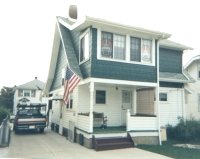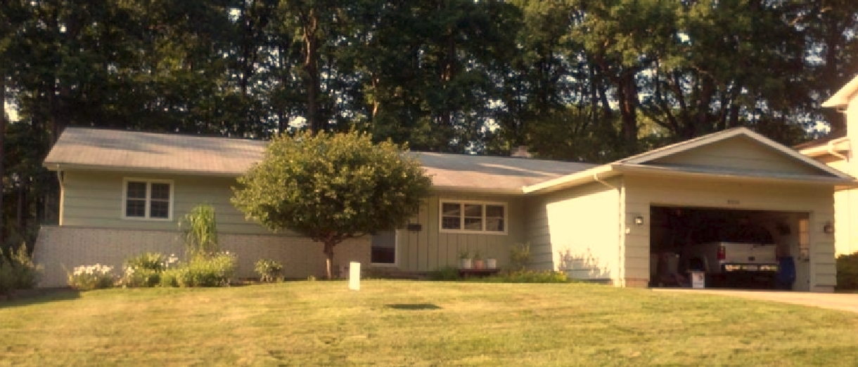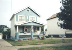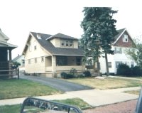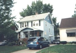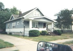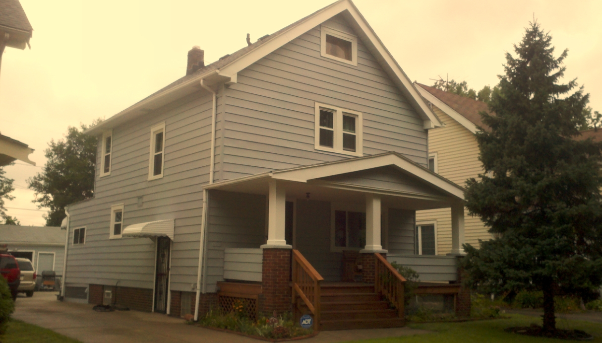 ![]() aluminum siding house-white&green trim Garfield Hts edge park home Grey wood siding home