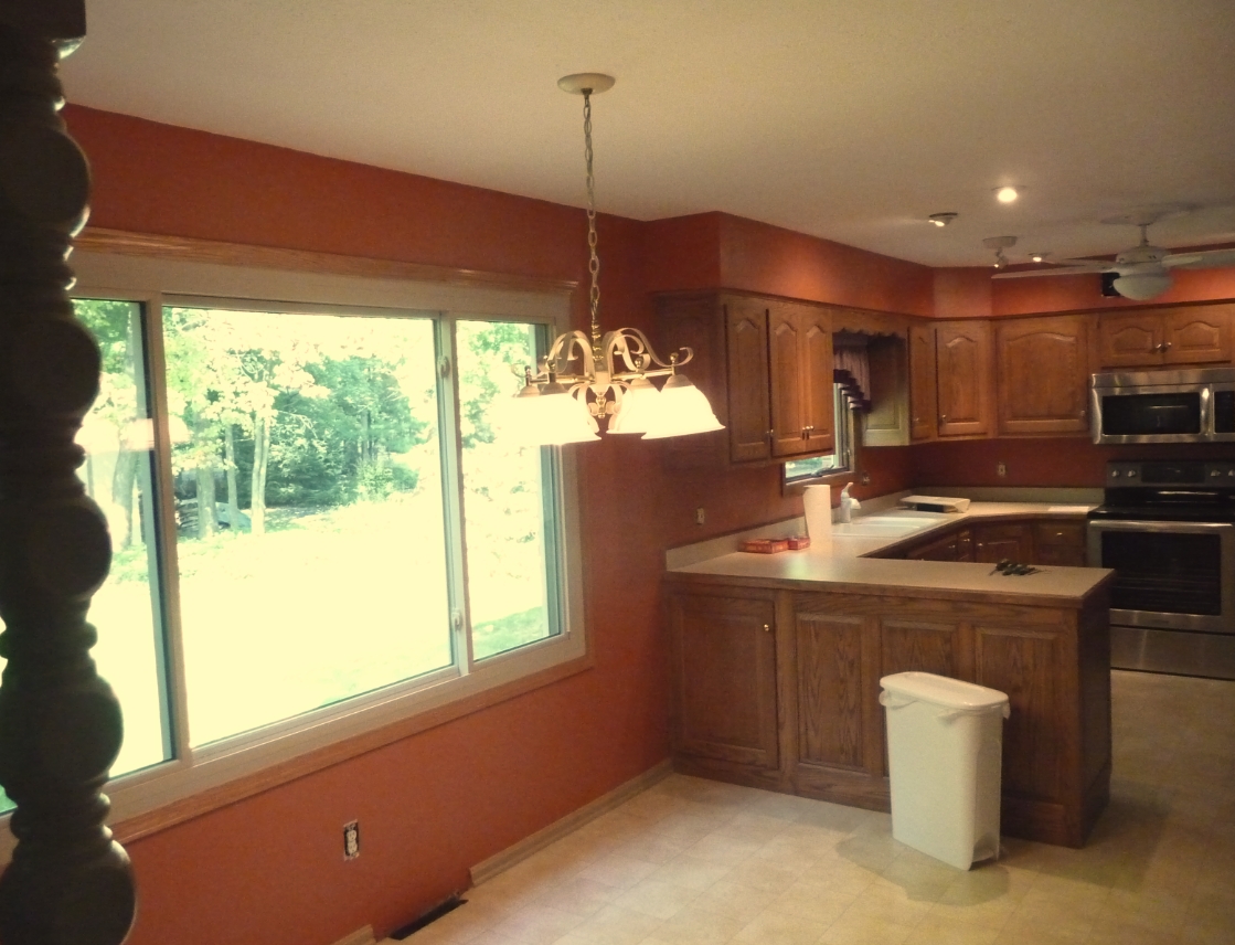 ![]() dining room-gold &green 2-tone split with chair rail Brooklyn home kitchen Garfield Heights colonial home interior side-view-kitchen original cabinets wallpaper-removal-prep kitchen painted cabinets white walls&ceiling-texured